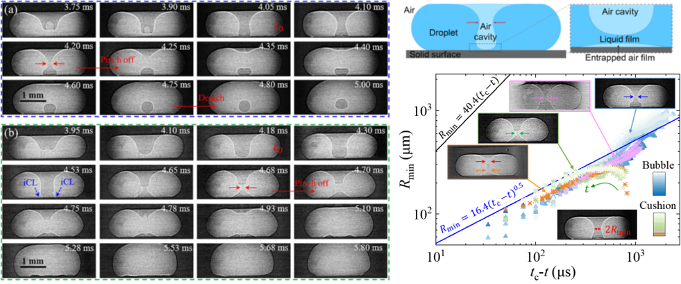 固液界面相互作用涉及典型的多尺度界面現(xiàn)象與流動過程,液滴撞擊固體表面時會沿中心軸產(chǎn)生圓柱形氣腔,并在液滴下方捕獲一層空氣薄膜。傳統(tǒng)觀點(diǎn)認(rèn)為這層氣膜在影響撞擊結(jié)果中起關(guān)鍵作用。之前的研究僅發(fā)現(xiàn)慣性主導(dǎo)的軸向內(nèi)爆導(dǎo)致氣腔夾斷并演化為氣泡,而對不形成氣泡的情況并不清楚,對氣腔與氣膜的相互作用也不了解。由于動態(tài)液滴中存在多個液氣界面和復(fù)雜的構(gòu)型變化,傳統(tǒng)光學(xué)成像方法無法深入解析多界面動力學(xué)。
