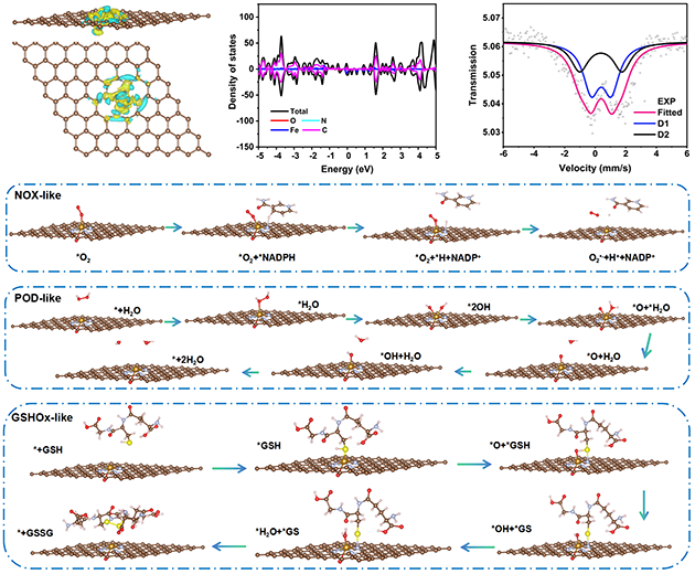 近日,中國科學院蘭州化學物理研究所天然藥物與化學測量研究中心海軍研究員團隊,發(fā)展了一種以氧化石墨烯為二維支撐載體的Fe單原子納米酶(FeNC SAzymes)。與傳統(tǒng)平面Fe-N4構型相比,軸向O配位的引入有效打破了對稱配位限制,增強了活性中心的電子調(diào)控能力(圖1)。此外,密度泛函理論計算解析該關鍵活性能有效降低多酶反應途徑的能量勢壘,從而提升NOX、POD和GSHOx等多酶樣級聯(lián)相關過程的反應效率,為后續(xù)觸發(fā)后放大效應提供基礎(圖2)。FeNC SAzymes結構設計使Fe中心的電荷分布和d軌道電子態(tài)密度得到優(yōu)化,從而提升其對反應中間體的吸附與活化能力以及電子轉(zhuǎn)移效率,為實現(xiàn)TME識別、可視化檢測和響應研究提供了新方法。
