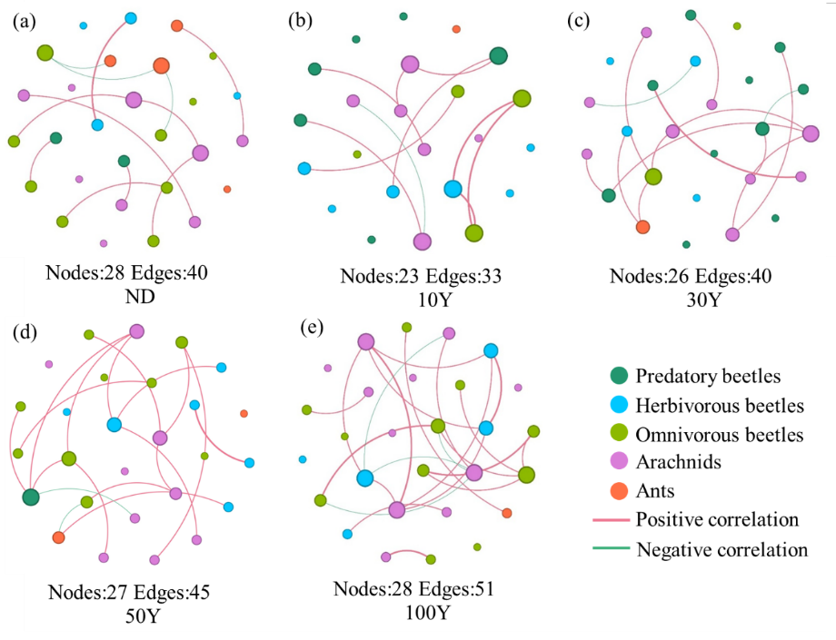 天然荒漠、10年、30年、50年和100年農(nóng)田不同營養(yǎng)級地表節(jié)肢動物的共線性網(wǎng)絡(luò)