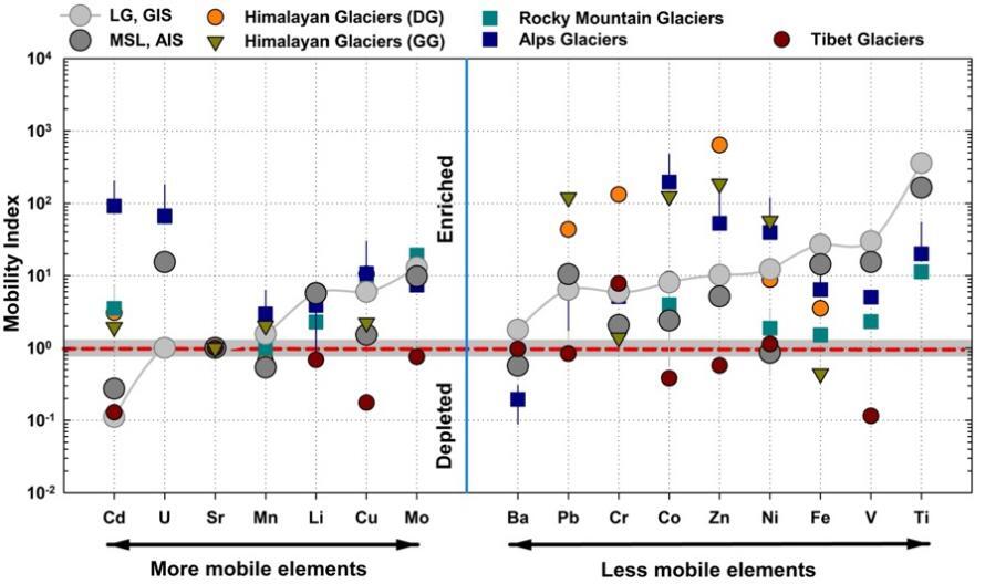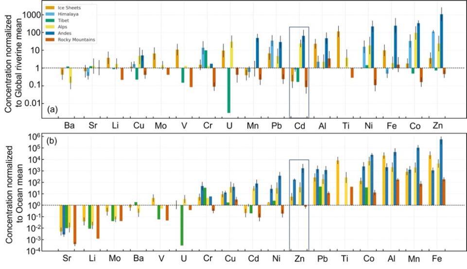 冰川與冰蓋融水中痕量金屬濃度相對于全球河流和海洋平均濃度的對比
