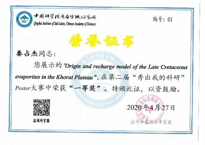 經(jīng)過(guò)專家評(píng)審和網(wǎng)絡(luò)投票,最終秦占杰博士《Origin and recharge model of the Late Cretaceous evaporites in the Khorat Plateau》和彭嬌玉博士《Research on Boron Recovery from Sulfate-type Saline Lakes with a Novel Dilution Method》,王廣國(guó)同學(xué)《Structure Study of Aqueous CaCl2 Solutions by Molecular Dynamics Simulations》和高靖易同學(xué)《Prehistoric human Activity and its Environmental Background in Lake Donggi Cona Basin, Northeastern Tibetan Plateau》分別斬獲大賽職工組和研究生組一等獎(jiǎng);高春亮博士等6名同志獲得二等獎(jiǎng),孫艷霞博士等10名同志獲得三等獎(jiǎng),本屆大賽為獲獎(jiǎng)?wù)咴O(shè)計(jì)了精美的證書。