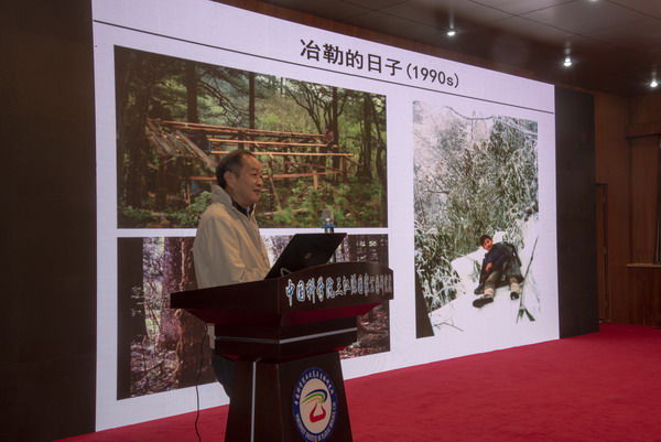 魏輔文院士以他的學(xué)術(shù)生涯為主線,講述了其自20世紀(jì)80年代開始從事大熊貓的研究工作,從最初的大熊貓野外調(diào)查、觀察,到率先將種群基因組學(xué)、宏基因組學(xué)、比較基因組學(xué)等新技術(shù)應(yīng)用到大熊貓研究中,闡明了大熊貓的種群歷史、瀕危過程及演化潛力,揭示了大熊貓?jiān)谑承赞D(zhuǎn)換和特化歷程中如何在形態(tài)、行為、生理、遺傳和腸道微生物等方面產(chǎn)生適應(yīng)性演化的規(guī)律;闡明了棲息地破碎化導(dǎo)致大熊貓孤立小種群崩潰的機(jī)制,推動了國家大熊貓放歸和棲息地廊道建設(shè)工程的實(shí)施。魏輔文首次提出“保護(hù)演化生物學(xué)”和“保護(hù)宏基因組學(xué)”新分支學(xué)科,并介紹了穩(wěn)定同位素分析技術(shù)和營養(yǎng)幾何模型分析等新技術(shù)和新方法。魏院士結(jié)合自己30多年在保護(hù)生物學(xué)領(lǐng)域的經(jīng)歷,鼓勵大家在科學(xué)道路上堅(jiān)持思考,不斷探索,勇于創(chuàng)新。此次報告大大開拓了與會人員的學(xué)術(shù)視野,鼓舞了廣大科技人員的科研熱情。