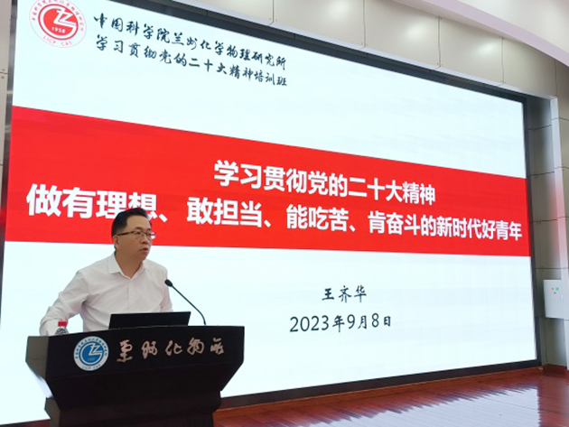 蘭州化物所黨委書記王齊華作了題為“學習貫徹黨的二十大精神 做有理想敢擔當能吃苦肯奮斗的新時代好青年”的專題黨課,并對全體研究生同學提出希望和要求。希望同學們以習近平新時代中國特色社會主義思想為指導,認真學習領會黨的二十大精神、習近平總書記關于科技創(chuàng)新的重要論述和指示批示精神。面向世界科技前沿、面向國家重大需求、面向國民經(jīng)濟主戰(zhàn)場、面向人民生命健康,刻苦鉆研,勇于創(chuàng)新,大力傳承弘揚科學家精神,培養(yǎng)高尚的品格、積淀豐厚的學養(yǎng)、保持良好的心理狀態(tài),努力成長為對國家、對民族有用的創(chuàng)新人才,把個人的理想追求融入黨和國家事業(yè)之中,為早日實現(xiàn)高水平科技自立自強貢獻青春力量和智慧。