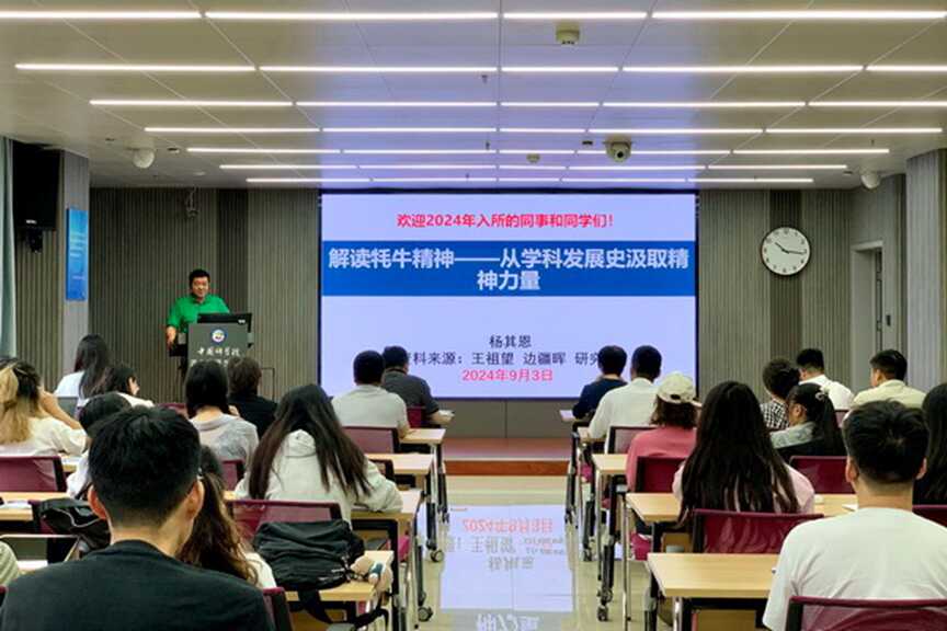 楊其恩作了“解讀牦牛精神——從學(xué)科發(fā)展史汲取精神力量”專題報(bào)告,報(bào)告從回顧研究所的發(fā)展歷程為切入點(diǎn),向大家講述了“牦牛精神”蘊(yùn)含的深刻意義和背后歷經(jīng)曲折、卓越堅(jiān)守、不計(jì)報(bào)酬、但求貢獻(xiàn)的過往,希望作為“國(guó)家隊(duì)”、“國(guó)家人”的新生力量,大家能夠保持真誠(chéng)與謙卑,抱利他之心、行利他之事,能夠心系“國(guó)家事”、肩扛“國(guó)家責(zé)”,面向國(guó)家需求、結(jié)合個(gè)人興趣,承先生前輩之創(chuàng)造、開科研范式變革之新局,做“牦牛精神”忠實(shí)地踐行者。