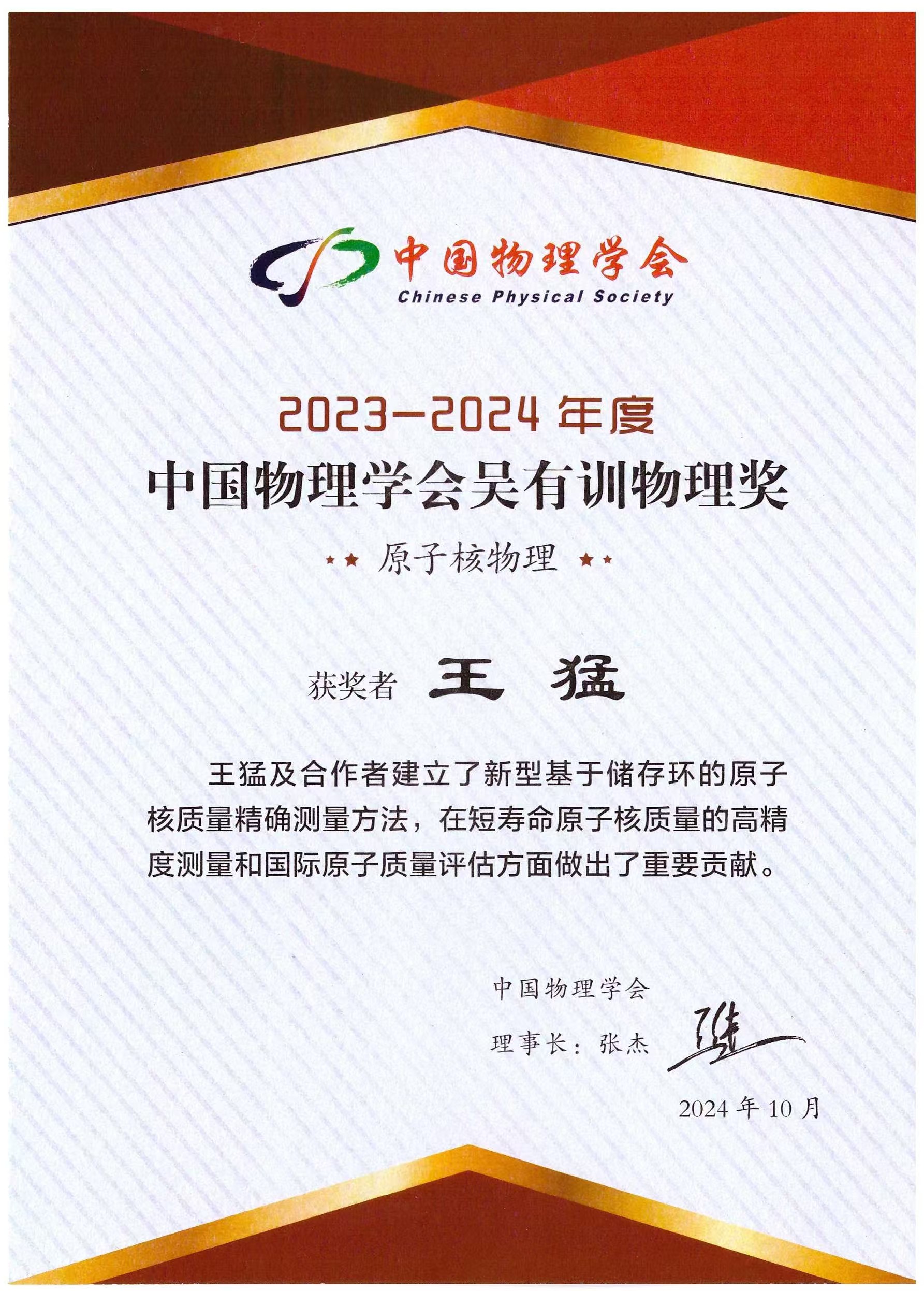 10月10日至13日,中國物理學會2024秋季學術會議在海南國際會展中心舉行。開幕式上舉行了2023-2024年度中國物理學會五項物理獎頒獎儀式,中國科學院近代物理研究所副所長王猛研究員榮獲吳有訓物理獎(原子核物理)。?