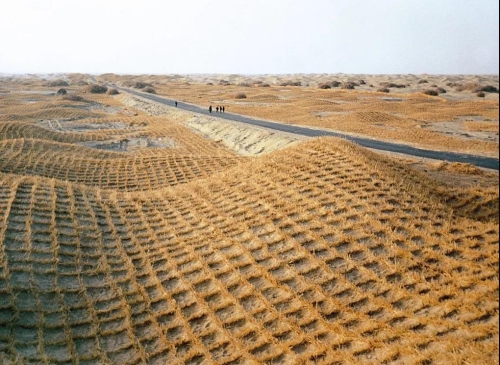 實(shí)際上,草方格最早應(yīng)用于我國(guó)第一條沙漠鐵路包蘭鐵路的建設(shè)中。在寧夏沙坡頭地區(qū)火車(chē)穿越了騰格里沙漠,在科技工作者和當(dāng)?shù)厝罕姷墓餐ο拢湶莘礁窬幊傻木蘧W(wǎng)最終成功縛住了“沙龍”。沙坡頭因此被稱(chēng)為“草方格的故鄉(xiāng)”。如今,一把鐵鍬,一捆麥草,一片草方格,沙坡頭實(shí)現(xiàn)了黃沙變綠洲的嬗變,騰格里沙漠中神奇地出現(xiàn)了一條連綿延伸的“綠帶”。